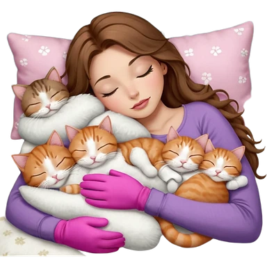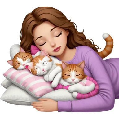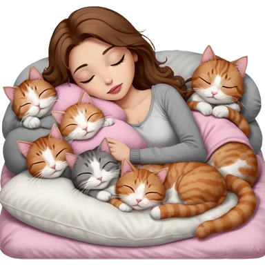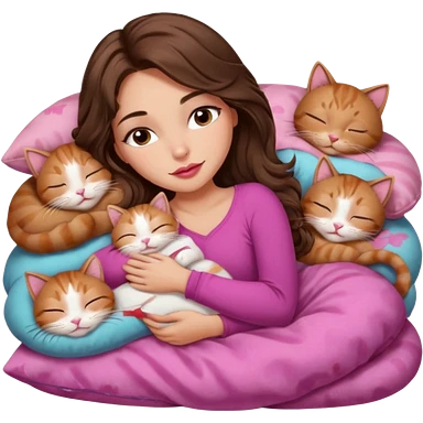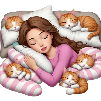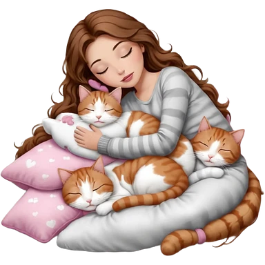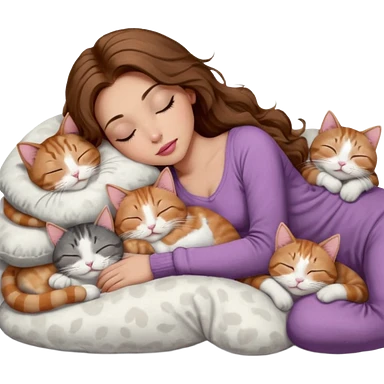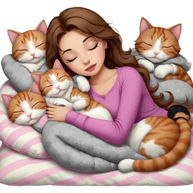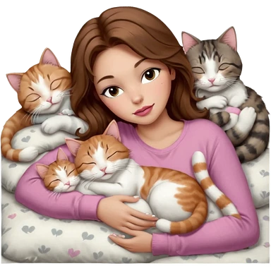 girl with long wavy brown hair, brown eyes, long lashes makeup, sexy pink lips, light to medium complexion, sleeping on a cozy pillow, with 6 cats: 1 brown and white tabby cat, 1 ginger and white, 2 grey and white, 1 grey has white mittens and small white patch on its chest and 1 calico, sleeping emoji