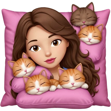 girl with long wavy brown hair, brown eyes, long lashes makeup, sexy pink lips, light to medium complexion, sleeping on a cozy pillow, with 6 cute cats, sleeping emoji