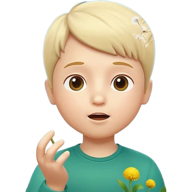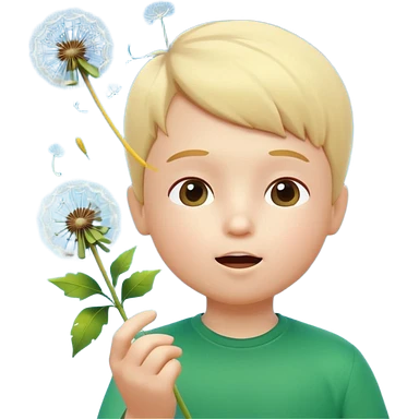 A 3D cartoon child blowing on a dandelion, seeds flying in the air, sunny garden background, realistic Memoji-style. emoji