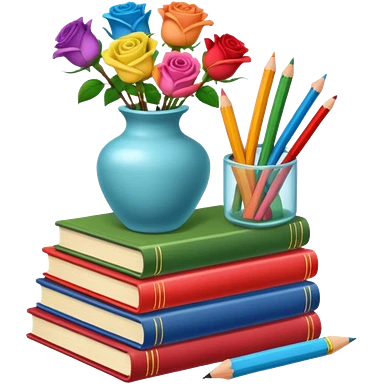 Five colorful books are stacked, along with a pencil holder full of crayons and a vase full of roses. The illustration style is cartoon. emoji