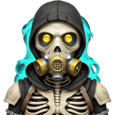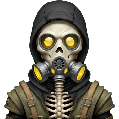 skeleton wearing a gas mask portrait, head and shoulders only, visible rib cage bones, cracked skull, dark hood, glowing eyes inside the mask, post-apocalyptic vibe, dramatic lighting, 3D cartoon, mobile game icon style, clean background, no text, no watermark emoji