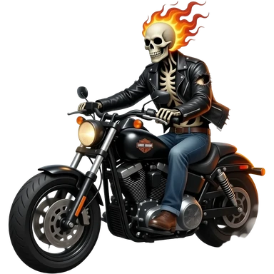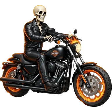 Skeleton on fire wearing black leatherriding black Harley davidson on fire. Fantasy emoji