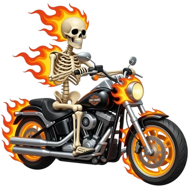 Skeleton on fire riding black Harley davidson on fire. Fantasy emoji