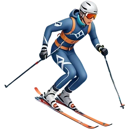An icon featuring a skier racing down a snow-covered slope, surrounded by snowy peaks and pine trees. The design includes ski poles, bright winter gear, and dynamic motion lines, capturing the thrill and speed of alpine skiing. Transparent background emoji