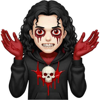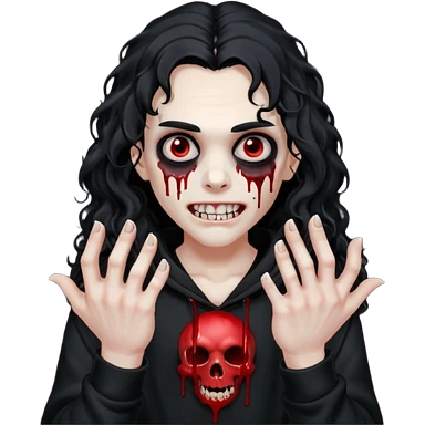 Vampire wearing a black hoodie with a skull logo on it, long curly hair that covers the forehead, fanged teeth and blood on hands emoji