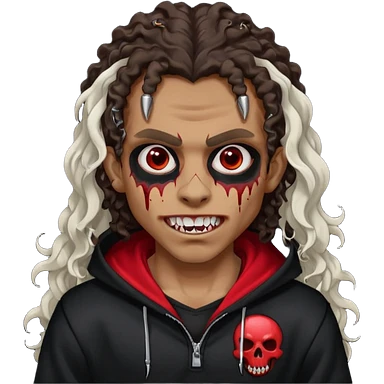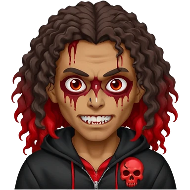 Vampire wearing black hoodie with a skull logo on it, long curly hair, brown skin, fanged teeth, blood under eye sockets/forehead, piercings on eyebrows and long curly hair with a patch (section) of red emoji