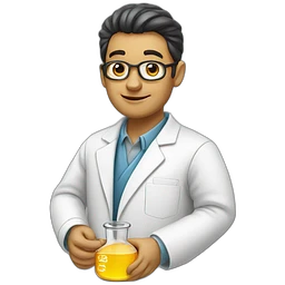 chemist in lab coat with chemical goggles holding a test tube, background with a board of chemical elements, apple emoji style, no text emoji