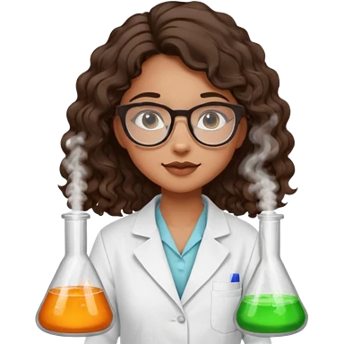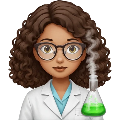 realistic bratz doll with long loose curly dark brown hair, glasses that are round cat eye vibes, in a lab coat mixing beakers that glow emoji