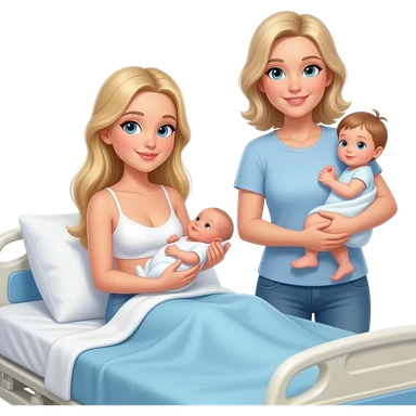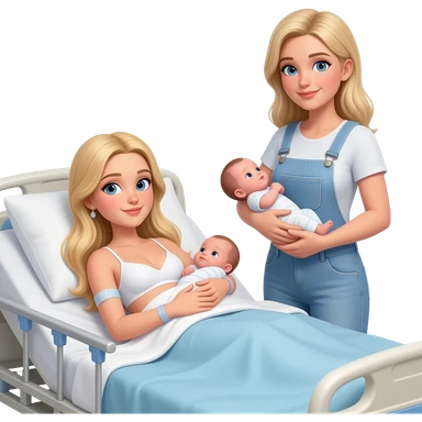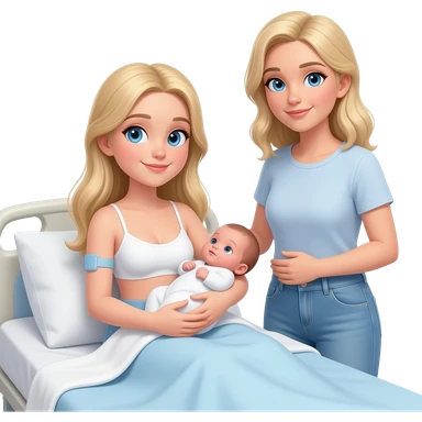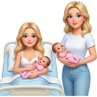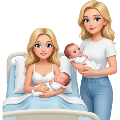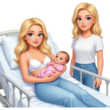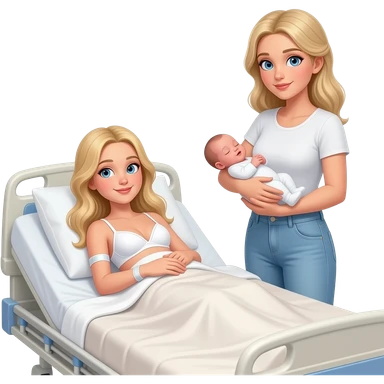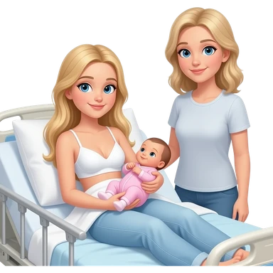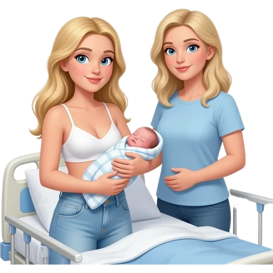 in hospital bed in blanket 17 year old Woman with long blonde hair, and light blue eyes, wearing white bra and light blue baggy jeans with skinny body, holding newborn girl, with 38 year old mom with blonde hair and blue eyes holding baby girl on the waist with one arm, standing beside bed emoji
