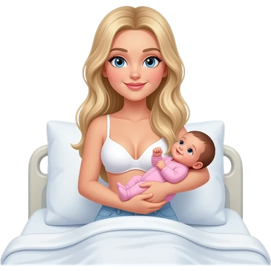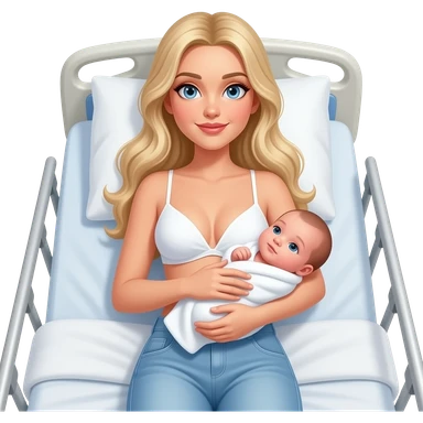 in hospital bed Woman with long blonde hair, and light blue eyes, wearing white bra and light blue baggy jeans with skinny body, holding newborn girl emoji