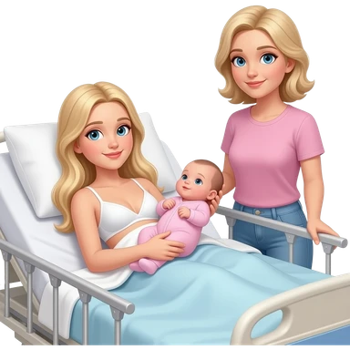 in hospital bed 17 year old girl Woman with long blonde hair, and light blue eyes, wearing white bra and light blue baggy jeans with skinny body, holding newborn girl wearing pink onesies, with 38 year old mom with blonde hair and blue eyes standing beside bed emoji