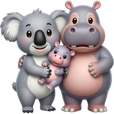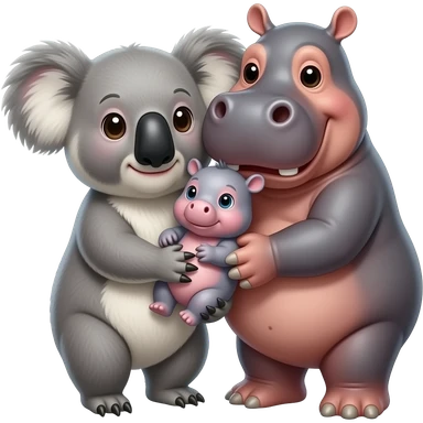 Skinny Koala and hippo holding their one baby hippo Together in both of their arms hugging emoji family realistic real emoji not cartoon cuddle emoji
