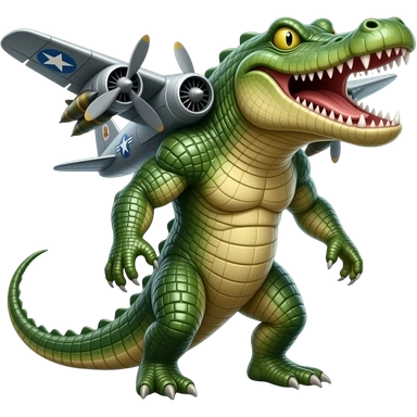 Surreal hybrid creature: a crocodile fused with a military bomber plane — green scaly body, metal wings, jet engines, and missiles. Aggressive grin, cartoon-realistic style, cinematic lighting. emoji
