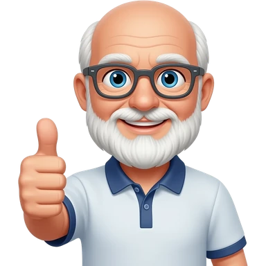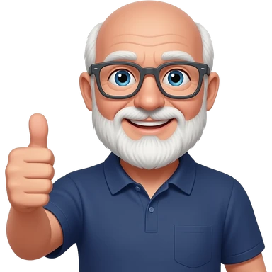 skinny old bald man with white beard with red tint, blue eyes, dark gray glasses, thumbs up, navy polo shirt, smiling emoji | AI Emoji Generator