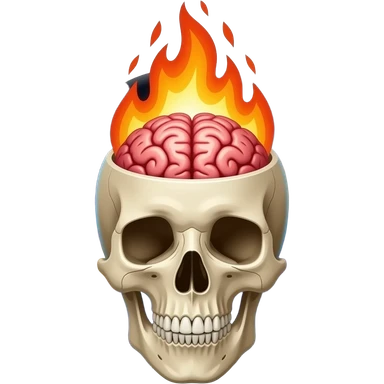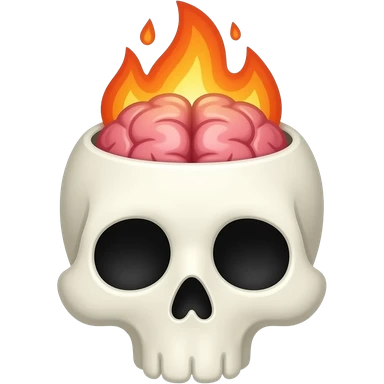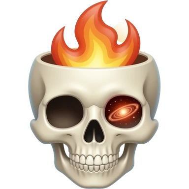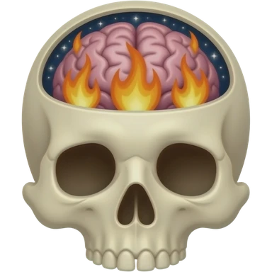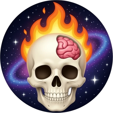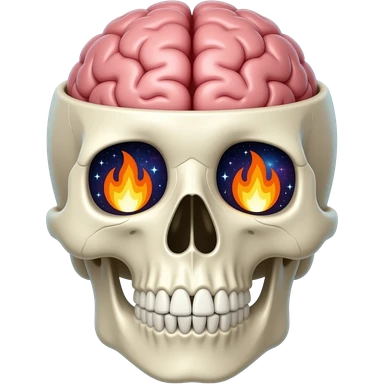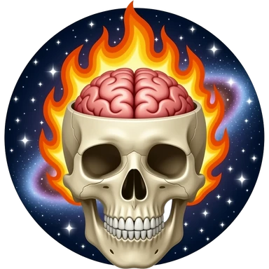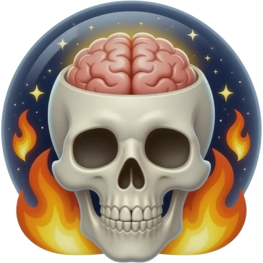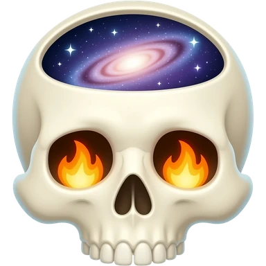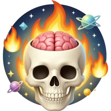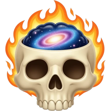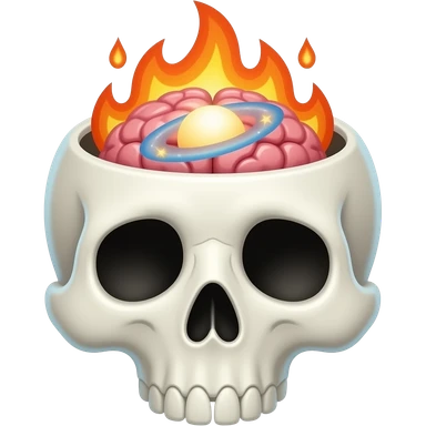 Apple-style emoji skull with an open head, brain bursting out with flames and a galaxy above it, smooth gradients, rounded shapes, clean and minimal, glossy finish, high contrast, centered, white background. emoji