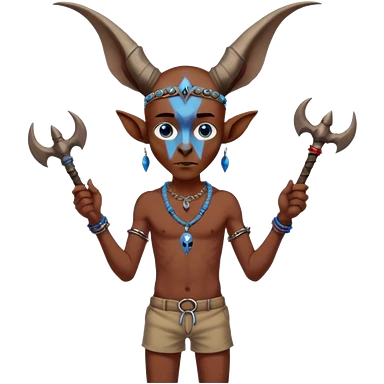 Red brownish figure with blue eyes a horn on his head long ears a skull necklace arms banded with something and a small bat with a band banded to the handle and the bottom being brown wearing a skinny brown short to cover his you know and but and long nails and long toenails emoji