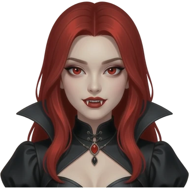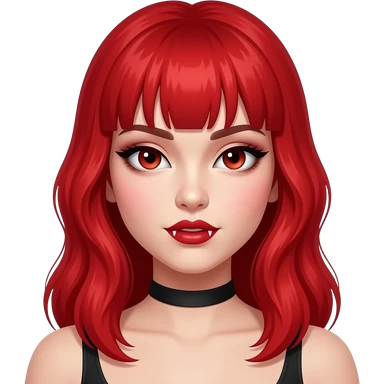 Vampire wearing black hoodie with a skull logo on it, long curly hair, brown skin, fanged teeth, blood under eye sockets/forehead, piercings on eyebrows and long curly hair with a patch (section) of red emoji