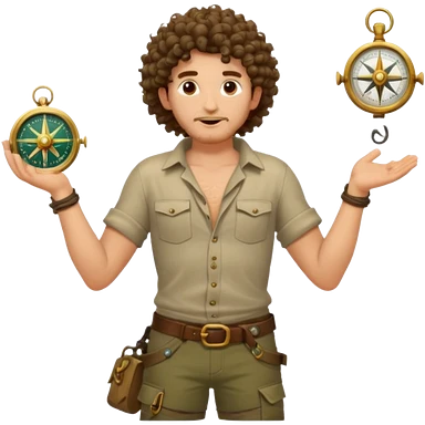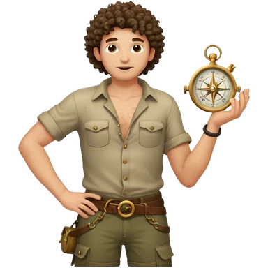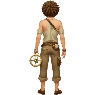 full body jungle explorer man, curly hair, from behind, half-open shirt slipping off shoulders, relic compass in hand emoji