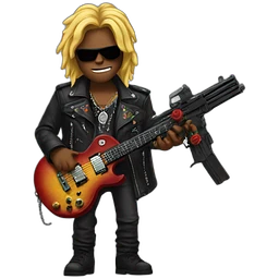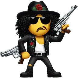 Create a rockstar emoji representing Slash from Guns'n Roses with his iconic Gibson Les Paul guitar. The design should feature Slash with his signature top hat, long curly hair, and sunglasses, holding the iconic Gibson Les Paul guitar. The guitar should be prominently displayed with its classic sunburst finish and gold hardware. Add subtle stage elements like a microphone stand and electric guitar cables to reflect the live performance energy. Use rich, dark colors like black, gold, and sunburst wood tones to convey the classic rock vibe. The background should be transparent. emoji