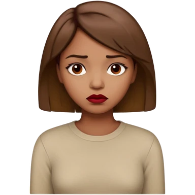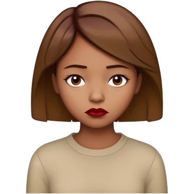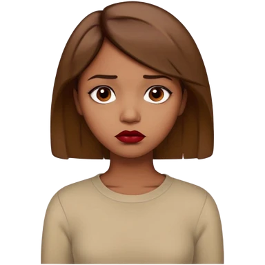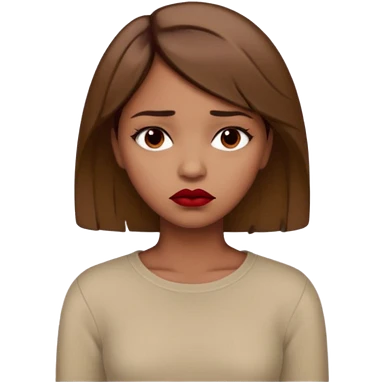 a brown girl with short light brown hair wearing a beige full sleeve and looking sad. dark red lip emoji