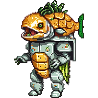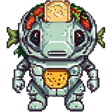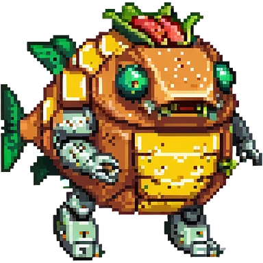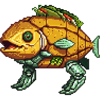 a cyborg robotic salmon who's torso is made from a filled crunchy taco, with lettuce salsa meat and cheese. he is fish taco bot man his face and head, tail, and fins are metallic robotic construction, he has a slit visor across his face where his eyes should be like cyclops emoji