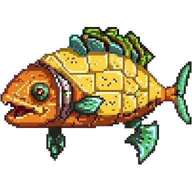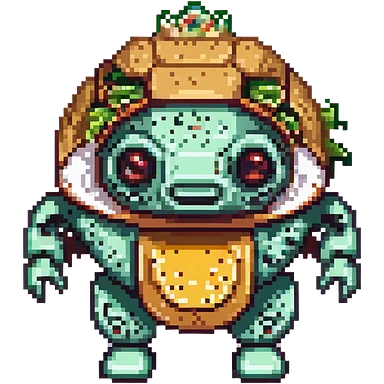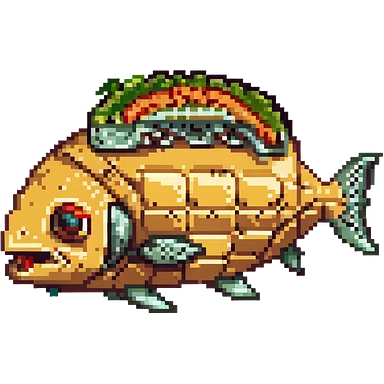 a cyborg robotic salmon who's body is made from a filled crunchy taco, with lettuce salsa meat and cheese. he is fish taco bot man his face and head, tail, and fins are metallic robotic construction, he has a slit visor across his face where his eyes should be like cyclops emoji
