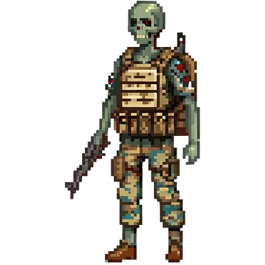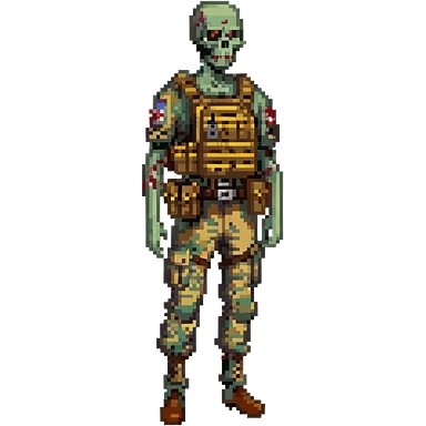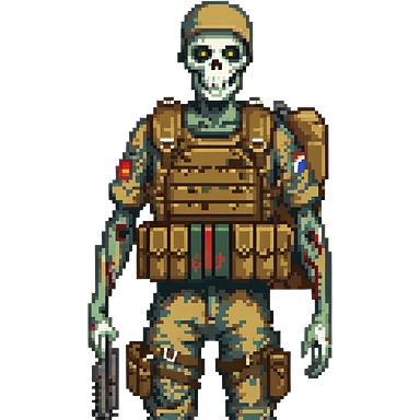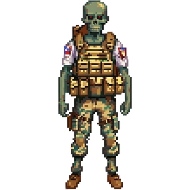 A zombie undead soldier, he has a bdu camouflaged uniform with a tan plate carrier, undead, leaned over posture, zombie, partially skeleton emoji