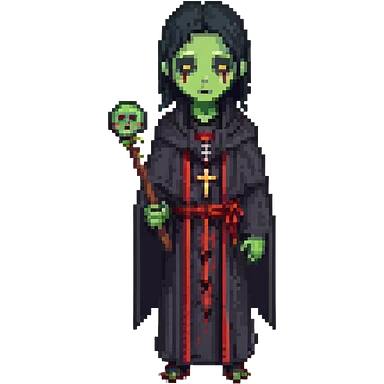 a zombie girl with black long hair and bangs, pixel art style, retro, 8-bit emoji