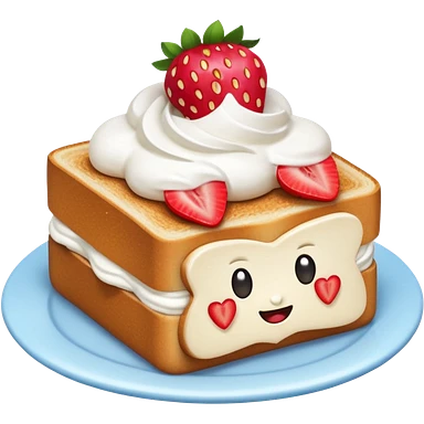 emoji illustration of a square toast topped with fluffy white cream, decorated with a strawberry bow made from two strawberry halves and a small sliced center, bright red and glossy, Clean soft shading, kawaii emoji style, centered object, no plate, no background, high detail, pastel tone emoji