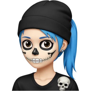 Spiky blue hair in a side ponytail wearing a black beanie with a skeleton logo on the front emoji
