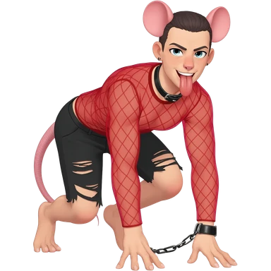 slim man with rat ears and rat tail in red transparent net top and black torn shorts is standing on the fours with his tongue out and wearing a leashed collar emoji
