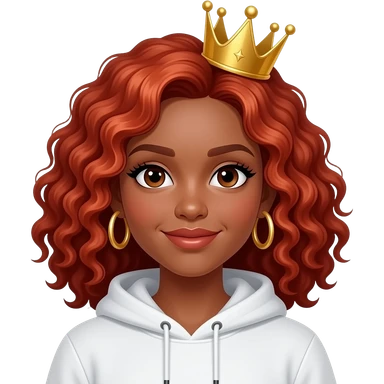 Slim girl with a fine face, dark chocolate-colored and tanned skin, medium-length curly tomato-red hair, dark eyes, medium-thick eyelashes, and a crown and hoop earrings wearing a white hooded sweatshirt. emoji