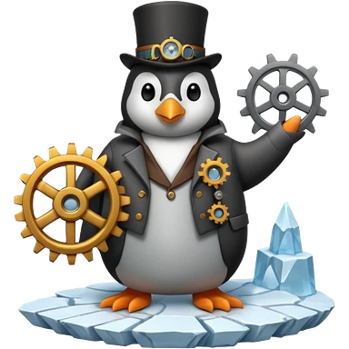 a steampunk engineer penguin fixing a complex gears system on top of an iceberg emoji