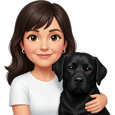 woman, middle aged, long dark hair, small earrings, brown eyes, cuddling black labrador, white t-shirt emoji