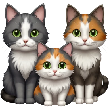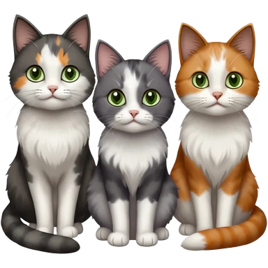 3 different coloured small cats including a dark grey and white, and a patchy calicowith hazel eyes and a completely solid dark grey with green eyes and only white paws emoji