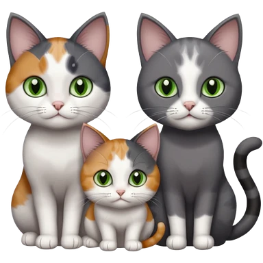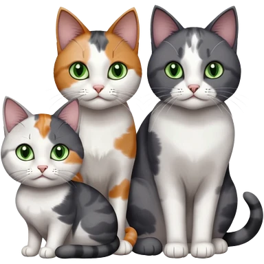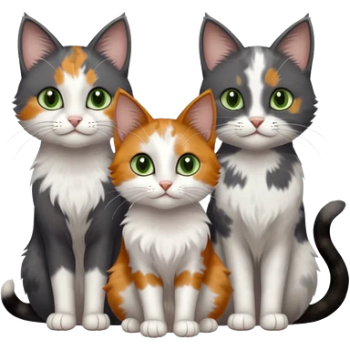 3 different coloured small cats including a dark grey and white, and a patchy calico with hazel eyes and a completely solid dark grey with green eyes and only white paws emoji