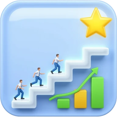 3D icon, career path for employees. Glowing staircase leading up to a star. Small human figures climbing steps. Growth chart at the base. Clean white background. Minimalist, corporate style emoji