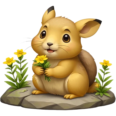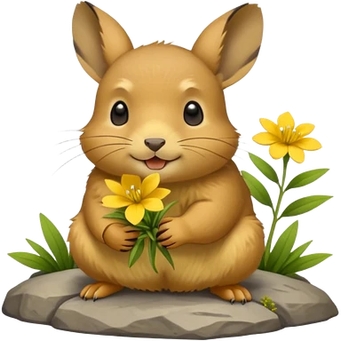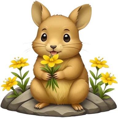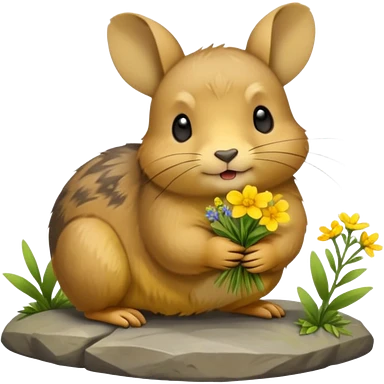 small round mountain pika on all fours, holding flowers in its mouth emoji