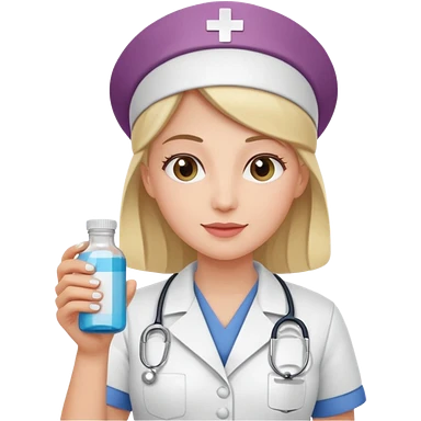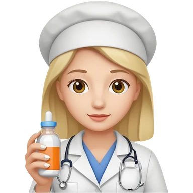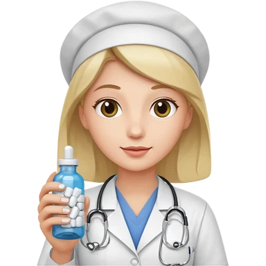 Emoji of a girl named Hiba, a pharmacist. She wears a white coat, has long straight dark brown hair, brown eyes, and a friendly smile. Add small pharmacy details like pills or a stethoscope emoji