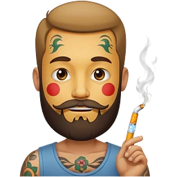 white man with a beard and ponytail, who doesnt smile, smoking a cigarette emoji