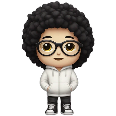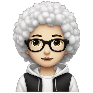 Pale boy, with fluffy black hair, black honeycomb shaped glasses, with a bone hairclip wearing a white hoodie with pink stripes emoji