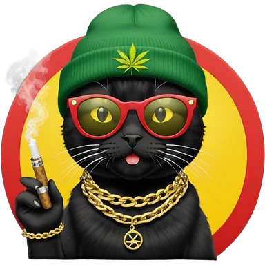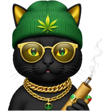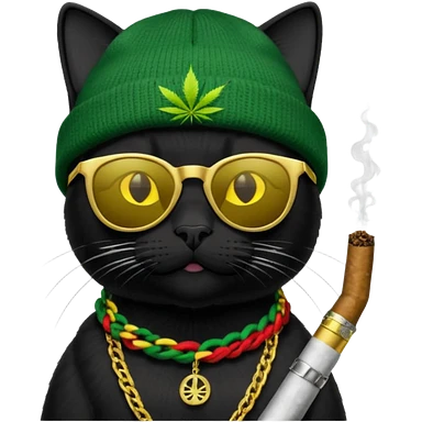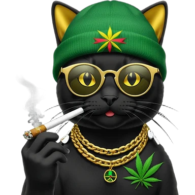 A black cat wearing the deal with it shades and a rasta beanie and smoking a joint and wearing a gold chain that says 420 and the words High Time at the top of the image emoji