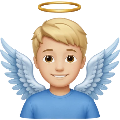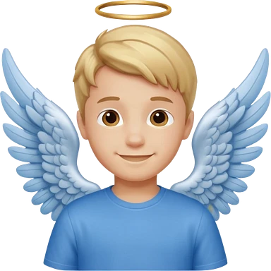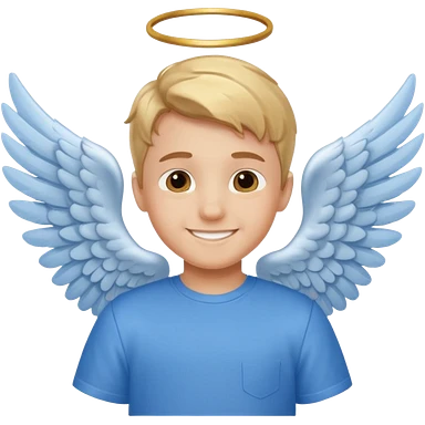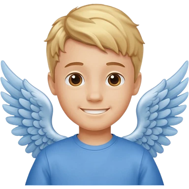 smiling boy in blue shirt with angel wings emoji