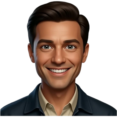 Portrait of an adult smiling man, fair skin, very short black-gray ombre hair, black eyes, wearing a black office suit and a white collared shirt underneath. emoji