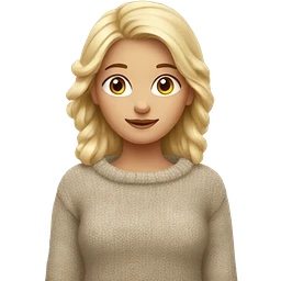 Woman wearing a cozy sweater, smiling kindly, with book emoji