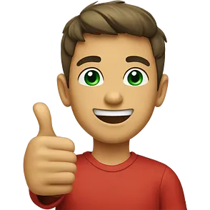 smiling boy in red shirt with thumbs up and green eyes emoji