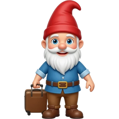 A smiling traveling Gnome carrying a suitcase, wearing brown pants has a white beard , blue eye, blue shirt and a red pointed hair emoji