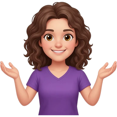 smiling face, brown curly shoulder length hair, hair touching shoulders, hazel eyes, pail skin, purple v-neck shirt, arms up in an emoji shrug position. emoji