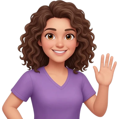 smiling face, brown curly shoulder length hair, hair touching shoulders, hazel eyes, pail skin, purple v-neck shirt, arms up inUse this emoji but with one arm down and the other arm waving emoji