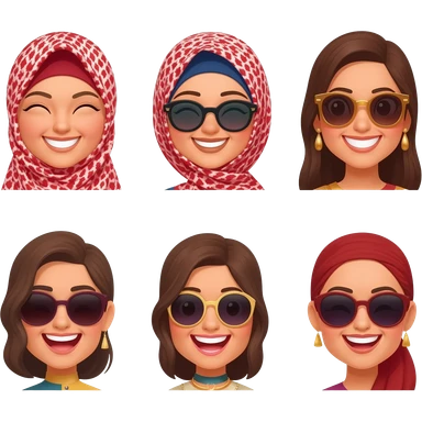 smiling face, cute face, luxury face & loving face, laughing face, beauty face, sunglass face generates 7 different emoji wearing Abhaya with hijab and different looking arabic ladies emoji | AI Emoji Generator